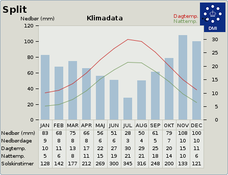 Se temperatur- og nedbørstabel over vejret i Split ved Adriaterhavskysten.