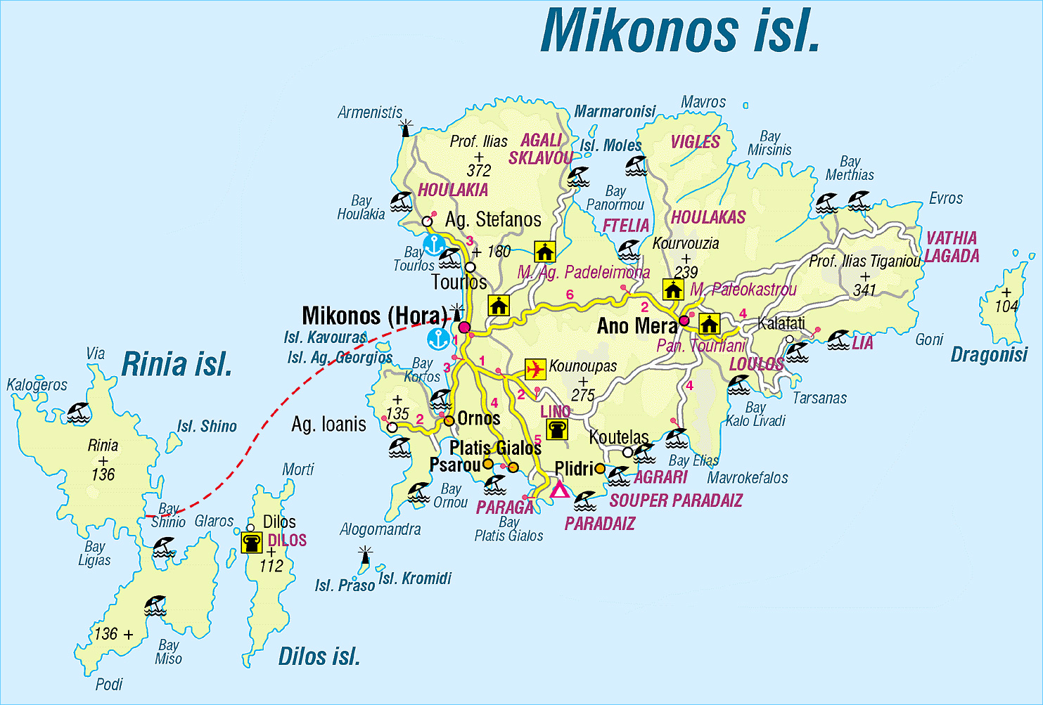 Se kort over hovedvejene på Mykonos.
