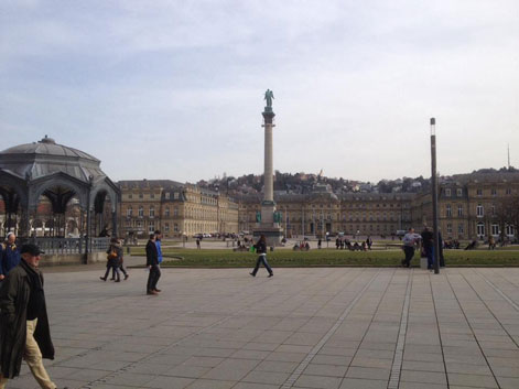 Stuttgart er en by, der rummer mange grønne områder og skjulte oaser, på trods af, at det er en storby. En af deres knap så skjulte oaser er slotsparken. Egentlig er der to dele af slotsparken - den hoveddelen ligger parallelt med hovedgaden, Königstrasse. Den anden del er slotspladsen, som ligger forbundet med Königstrasse. Her er det ikke unormalt at folk sætter sig på græsset foran slottet med en øl og frokost eller blot for at slappe af.